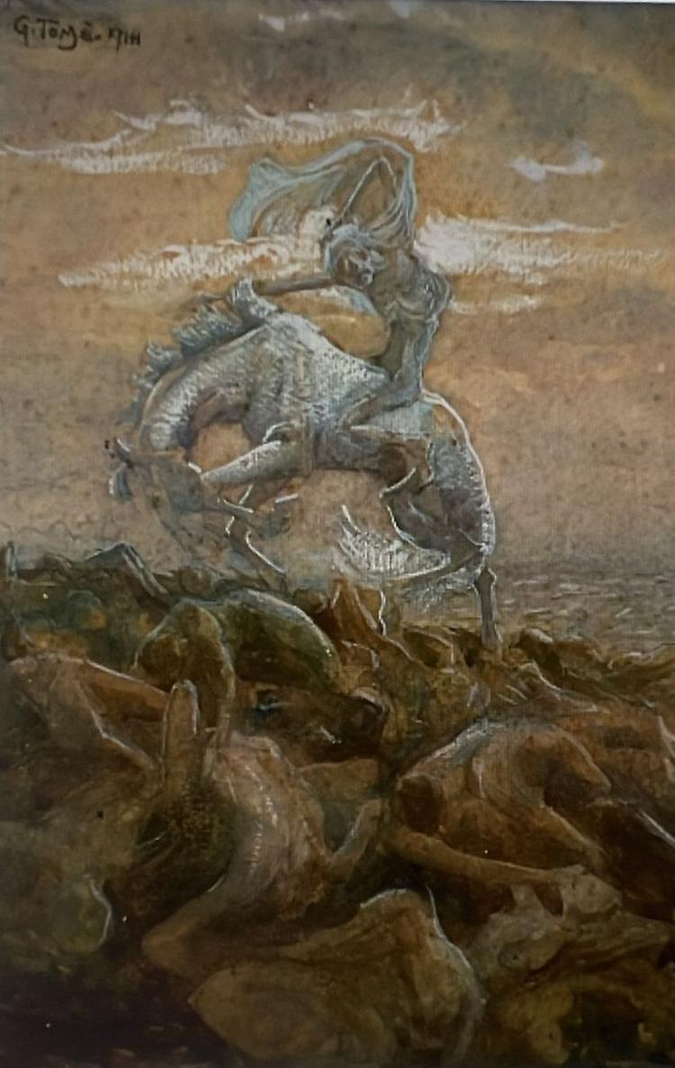 Tomé, per esempio, ha ventisette anni quando va a combattere sul Carso e ci va portandosi dietro anche i pennelli, i cartoncini, gli acquerelli. Già nel 1914, a poche settimane dall’inizio del conflitto, dipinge una scena apocalittica che preconizza quella che papa Benedetto XV definirà l’«inutile strage»: un cavaliere scheletrico su un altrettanto scheletrico cavallo bianco avanza calpestando corpi nudi e lividi, spogliati di ogni divisa. Il piccolo formato non rende meno drammatica l’opera, anzi.
