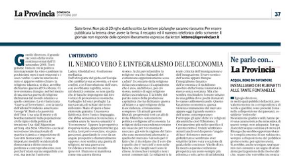 A chi può infastidire la religione ora che i baluardi del comunismo apparentemente sono caduti? Il contrario della religione della trascendenza è il capitalismo che è ateo, nichilista e, per ciò stesso, nemico di ogni religione della trascendenza. È la lobby del partito unico della produzione capitalista che ha dichiarato guerra all’islam e a ogni religione della trascendenza, cristianesimo compreso. Gli attuali governi liberali-progressisti veri cavalli di troia. Obiettivo: sottomettere politica e religione all’economia. Le religioni della trascendenza restano un ostacolo per l'economia di mercato: già solo in ragione del fatto che sono monoteismi alternativi a quello del mercato. Già solo per il fatto che ci ricordano che il vero dio è quello che è ‘nei cieli’ e non nelle banche; che i luoghi sacri sono le chiese, le moschee i templi e non i centri commerciali.