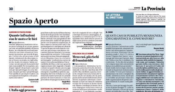 è doveroso e gratificante per me, a nome del consiglio direttivo, dei Volontari dell’Associazione S.a.I. - Sostegno all’Infanzia Onlus di Cremona e mio personale, ringraziare pubblicamente a mezzo stampa l’Associazione vigili del fuoco del Comando di Cremona per la cospicua donazione elargita al sodalizio che rappresento durante la commovente e suggestiva cerimonia avvenuta lunedì 4 dicembre scorso presso la caserma di Via Nazario Sauro in occasione della festa di Santa Barbara, per le statutarie finalità di solidarietà sociali rivolte ai bambini in terra di missione. Ed altresì complimentarmi con gli appartenenti alla stessa per aver voluto ricordare tangibilmente anche un’altra realtà benefica similare alla nostra operante in Perù, tramite don Giuseppe Ghisolfi, parroco di Borgo Loreto ed aver inoltre premiato due studenti meritevoli congiunti di loro colleghi. Nel contempo mi associo, amareggiata, alla pubblica condanna per il vile e squallido furto dell’elmetto presso il cippo eretto al civico cimitero a ricordo dei vigili del fuoco defunti.