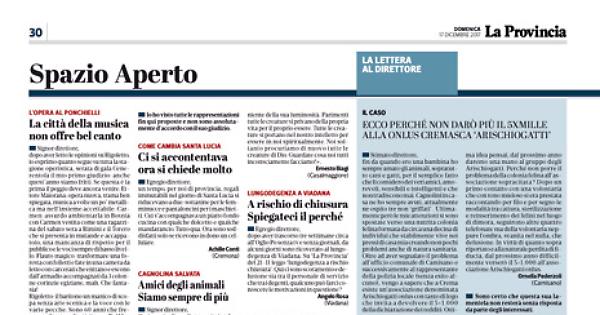 Oltre ad aver segnalato il problema all’ufficio comunale di Camisano e successivamente al rappresentante della polizia locale (senza esito alcuno), vengo a sapere che a Crema esiste un’associazione denominata Arischiogatti onlus con tanto di logo che invita a devolvere il 5×1.000 della dichiarazione dei redditi. Ottima idea pensai, dal prossimo anno daremo una mano al gruppo degli Arischiogatti. Perché non porre il problema della colonia felina all’associazione sopracitata? Dopo un primo contatto con una volontaria che con tono mieloso si era prestata raccontando per filo e per segno le modalità tra cattura, sterilizzazione e reinserimento dei felini nel luogo di dimora, seguirono altre quattro telefonate ma della volontaria neppure l’ombra, svanita nel nulla, che delusione. In virtù di quanto sopra riportato e alla naturale perdita di fiducia, dal prossimo anno difficilmente verserò il 5×1.000 all’associazione Arischiogatti onlus.