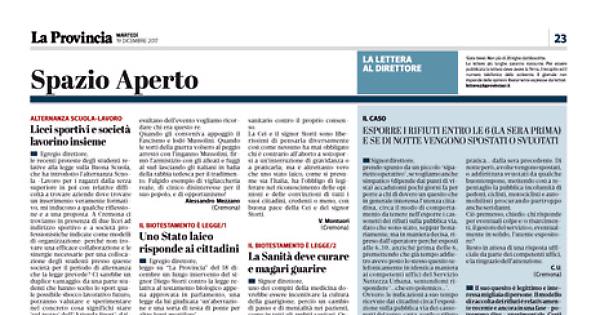 le recenti proteste degli studenti relative alla legge sulla Buona Scuola, che ha introdotto l’alternanza Scuola -Lavoro per i ragazzi dalla terza superiore in poi con relative difficoltà a trovare aziende dove trovare un inserimento veramente formativo, mi inducono a qualche riflessione e a una proposta. A Cremona ci troviamo in presenza di due licei ad indirizzo sportivo e a società professionistiche indicate come modelli di organizzazione: perché non trovare una efficace collaborazione e le sinergie necessarie per una collocazione degli studenti presso queste società per il periodo di alternanza che la legge prevede? Ci sarebbe un duplice vantaggio: da una parte studenti che hanno scelto lo sport quale possibile sbocco lavorativo futuro, potranno valutare e sperimentare nel concreto cosa significhi stare ‘sul pezzo’ dell’‘Azienda Sport’; dall’altro le società potranno valutare e reclutare potenziali collaboratori per il futuro, preziosi soprattutto per i mutamenti tecnologici in atto, anche nel mondo sportivo. Sarà mia premura portare la proposta al prossimo Consiglio del Panathlon (...) che potrebbe essere il collante per l’attuazione del progetto.