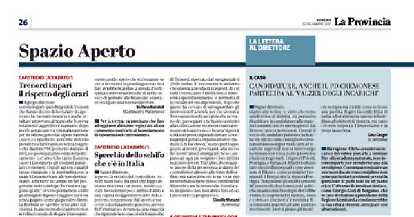 mi riferisco alla vicenda del capotreno di Trenord, riportata dal suo giornale il 20 dicembre. E’ veramente scandaloso che questa azienda di trasporti, di cui tutti conosciamo l’inefficienza dimostrata quotidianamente, si permetta di licenziare un suo dipendente, dopo che questi ha cercato di salvaguardare gli interessi dell’azienda per cui lavorava. Trovo assurdo ed esecrabile che nessuno dei passeggeri che hanno assistito alla colluttazione sia intervenuto a sostegno del capotreno e che una ‘signora’ si sia solo preoccupata di filmare la scena per poi gettarla in pasto alla rete mediatica di Facebook. Siamo purtroppo, grazie ai nostri governanti, alla mercé dei nostri ‘amici’ immigrati che accampano ad ogni pié sospinto i loro diritti e mai i loro doveri. Tra l’altro, il senegalese autore della prepotenza ai danni del controllore è già noto alle forze dell’ordine, ma naturalmente se ne va in giro indisturbato a spese di noi contribuenti. Mi sembra anche strano che il sindacato, in questo caso, non abbia fino ad ora fatto sentire la propria voce.