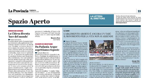 Su ‘La Provincia’ del 4 maggio ella rispose ad una mia ironica provocazione, promettendo di dare notizia della Marcia per la Vita, svoltasi a Roma il 19 maggio, con una ragguardevole presenza di giovani, di genitori con carrozzine, di associazioni pro life da tutto il mondo e con la partecipazione ad un gruppo di cremonesi.