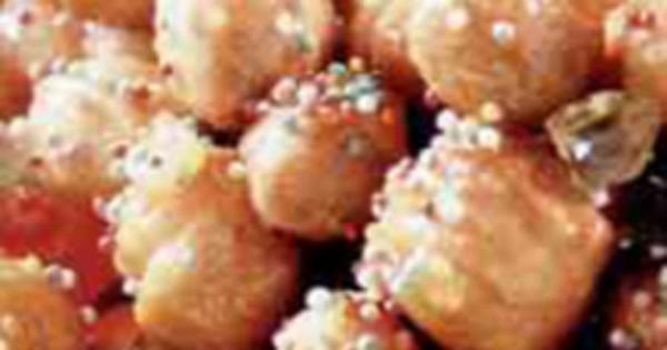 Per prima cosa disponete la farina a fontana e impastatela con le uova, il burro, lo zucchero, la scorza di limone, il liquore (rum o limoncello) e un pizzico di sale. Lasciate riposare l’impasto per mezz’ora, quindi formate delle sfere da cui ricaverete dei bastoncini grandi quanto un dito. Tagliateli a pezzetti di non più di 10millimetri di diametro e friggeteli in abbondante olio. Nel frattempo fate sciogliere il miele a bagnomaria, toglietelo dal fuoco e unite gli struffoli. Girate con delicatezza per qualche minuto, unite la metà dei confetti e della frutta candita. Disponete infine gli struffoli intorno a un barattolo di vetro che toglierete appena il miele si è indurito.