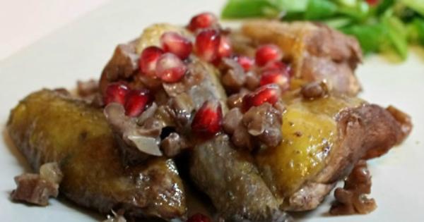 Ingredienti: 1 faraona a pezzi, 2 scalogni, 2 melograni, farina bianca q.b., un goccio di vino bianco secco, olio extravergine di oliva, rosmarino, sale e pepe.