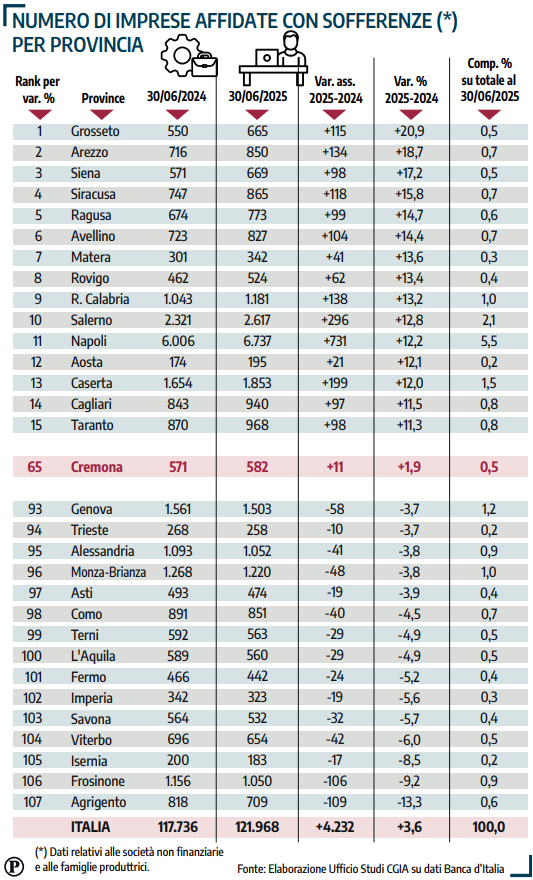CREMONA - Lo spettro dell’usura sulle aziende cremonesi, in particolare le piccole attività, comprese quelle artigianali. Aumenta del 2% il numero di imprese che rientrano nella categoria delle ‘affidate con sofferenze’, ovvero che risultano insolventi. Lo certifica la Cgia di Mestre in un recente studio. In città e provincia erano 571 nel 2024, sono saliti a 582, dato aggiornato alla fine di giugno di quest’anno, con un incremento di 11 unità. La percentuale di incremento pone il territorio è al 65esimo posto nazionale, in una graduatoria che vede al primo posto la provincia di Grossetto, dove le aziende considerate a rischio usura sono aumentate di quasi il 21%. Poi Arezzo, con il +18,7% e Siena (+17,2%).