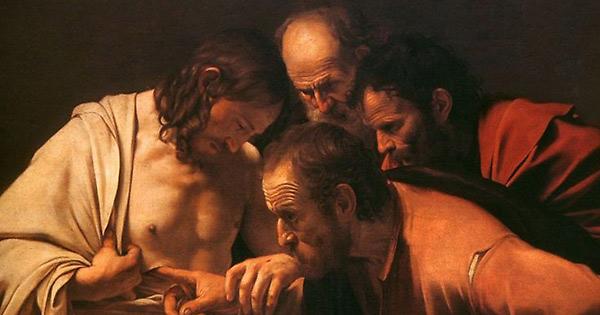 La sera di quel giorno, il primo della settimana, mentre erano chiuse le porte del luogo dove si trovavano per timore dei Giudei, venne Gesù, stette in mezzo e disse loro: «Pace a voi!». Detto questo, mostrò loro le mani e il fianco. E i discepoli gioirono al vedere il Signore. Gesù disse loro di nuovo: Pacxe a voi! Come il Padre ha mandato me, anche io mando voi! Detto questo soffiò e disse loro: «Ricevete lo Spirito Santo. A coloro a cui perdonerete i peccati saranno perdonati, a coloro a cui non perdonerete non saranno perdonati ». Tommaso uno dei Dodici, chiamato Didimo, nonera con loro quando venne Gesù. Gli dicevano gli altri discepoli: «Abbiamo visto il Signore!». Ma egli disse loro:«Se nonvedo nelle sue mani il segno dei chiodi e non metto ilmio dito nel segno dei chiodi e non metto la mia mano nel suo fianco, io non credo». Otto giorni dopo i discepoli erano di nuovo in casa e c’era con loro anche Tommaso. Venne Gesù ...poi disse a Tommaso: «Metti qui il tuo dito e guarda le miemani; tendi la tua mano e mettila nel mio fianco e non essere incredulo, ma credente!»...
