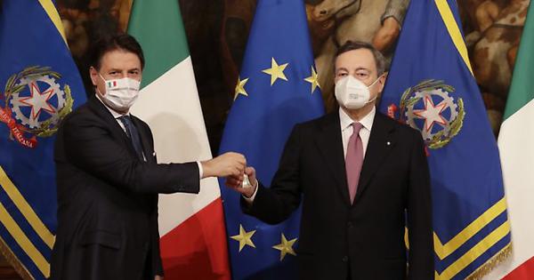 ROMA (13 febbraio 2021) - Giuseppe Conte ha passato la campanella a Mario Draghi, nella tradizionale cerimonia che segna il passaggio di consegne a Palazzo Chigi. Con il passaggio della campanella il nuovo presidente del Consiglio si insedia ufficialmente alla guida del governo. (ANSA).