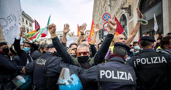 ROMA (21 aprile 2021) - Attimi di tensione, con qualche spintone, durante la manifestazione dei lavoratori Alitalia al centro di Roma. I manifestanti si sono spostati da piazza Santi Apostoli riversandosi a piazza Venezia e bloccando il traffico. Un gruppo di manifestanti è ancora a Piazza Venezia monitorato dalle forze dell'ordine. (ANSA)