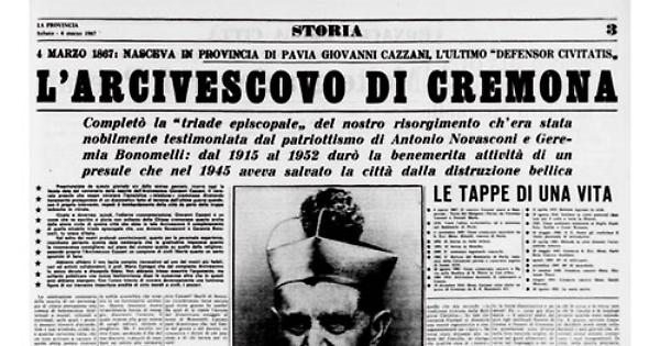 L'Arcivescovo Giovanni Cazzani, il venerato presule che seppe coronare l'apostolica « missione » cremonese divenendo "il benemerito protagonista di un drammatico fatto al termine dall'ultima guerra quando con il proprio intervento, impedì il bombardamento della città da parte delle truppe.... e la lapide posta sotto i portici del Palazzo Comunale, ricorderà ai posteri l'animo invitto del Cazzani.