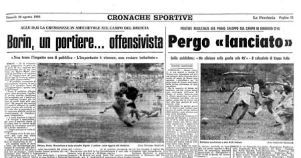 * Alle 20,45 la Cremonese in amichevole sul campo del Brescia. Borin, un portiere....offensivista. « Non temo l'impatto con il pubblico - L'importante è vincere, non restare imbattuto ». Borno - E' il numero uno grigiorosso, si trova alle porte di una stagione importantissima per la sua carriera: ma Mauro Borin, portiere di mestiere e di vocazione, da l'impressione di non essere tipo da lasciarsi schiacciare dalle responsabilità.