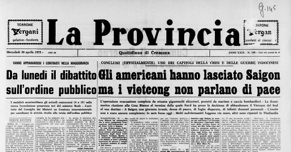 Dopo 30 anni si chiude la guerra in Vietnam con la caduta di Saigon e la presa del potere da parte del regime comunista del Vietnam del Nord, che unificherà il paese dando vita, un anno dopo, alla Repubblica Socialista del Vietnam.
