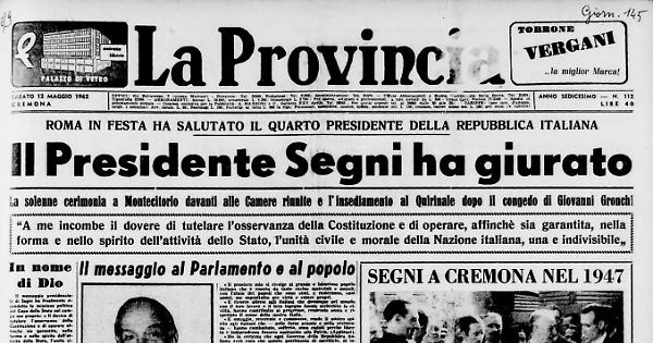 La solenne cerimonia a Montecitorio datanti alle Camere riunite e l'insediamento al Quirinale dopo il congedo di Giovanni Gronchi