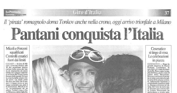Sulla strada da Mendrisio a Lugano già alla prima curva è chiaro che il Pirata ha deciso di inventare un altro arrembaggio. Per la prima volta aggredisce la pianura come fosse un'arrampicata. Pedala con le spalle ferme come fanno i passisti. Tiene le mani sull'impugnatura allungata come un cronoman. Si alza poco sui pedali e dopo appena tre chilometri è in vantaggio di, 3" su Pavel Tonkov. E il primo segnale, l'annuncio del trionfo. Il margine aumenta, sale a 10" a 22 chilometri dalla fine. Significa che dovrebbe perdere cinque secondi a chilometro per dar via la maglia rosa: semplicemente impossibile. Ed infatti quando passa in ritardo (di 3 fra il km. 20 ed il km. 24) solo i più emotivi fremono. Beppe Martinelli sull'ammiraglia già piange per l'inseguimento compiuto. Ci sono voluti quattro anni, ma finalmente il Giro d'Italia è del suo eroe. Era il '94 quando Marco inventò un folle inseguimento a Berzin e Indurain. Volò sul Mortirolo e in due mesi arrivò secondo al Giro e terzo al Tour.