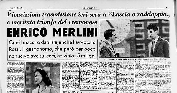I cremonesi, hanno seguito con particolare interesse l'ultima parte della trasmissione di ieri di « Lascia o raddoppia»: doveva presentarsi il loro concittadino Enrico Merlini, quello che sa tutta la « Divina Commedia » a memoria per rispondere alle tre domande finali che avrebbero dovuto assicurargli il premio massimo di 5 milioni e 120.000 lire; e che avrebbe dovuto contribuire a tener alto il nome della nostra città dopo la non riuscita prova di altri due cremonesi. L'avvenimento a carattere locale, aveva contribuito a far moltiplicare ieri sera il numero dei telespettatori; così che, dovunque vi fosse un televisore, vi era folla. Con ansia particolare, la trasmissione è stata seguita nei saloni della Cooperativa Donati in via Ceresole, ove si erano riuniti la mamma, la sorella ed il fratello di Merlini, che con ansia hanno ascoltato il succedersi delle domande e delle risposte. Un grande applauso si è alzato nella sala quando Merlini, ha trionfalmente risposto all'ultimo quesito e tutti si sono stretti intorno alle tre persone felici per complimentarsi con loro.