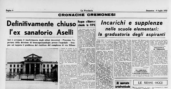 Ieri ha lasciato l’Aselli l'ultimo ammalato, trasferito in altra sede; contemporaneamente tutto il personale è passato alle dipendenze degli Istituti Ospitalieri e così le tensioni e le lunghe diatribe sono finite. Incominciano ora quelle inerenti al riutilizzo dell'ex sanatorio.
