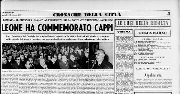 «Oggi, celebrandoLo nella sua terra generosa e fervida, di cui espresse le qualità più alte di patriottismo (in guerra e in pace) e le ansie sociali in un regime di democrazia e di libertà, noi sentiamo che i miglior modo per ricordarlo ed il più alto onore alla sua memoria è quello di associare il suo nome e la sua opera al ventesimo della Costituzione». Queste le nobili parole che il senatore a vita Giovanni Leone ha pronunciato domenica al Cittanova a conclusione della commemorazione dell'ex presidente della Corte Costituzionale on. avv. Giuseppe Cappi.