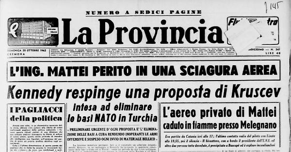 MILANO - Il presidente dell’ENI Enrico Mattei è perito stasera precipitando con l’aereo privato, assieme ad altre due persone, a Bascapè, presso Melegnano: il bireattore «Moran-Soulmier» 760 era partito dall'aeroporto di Fontanarossa, nei pressi di Catania alle ore 17. La torre di controllo dell'aeroporto di Catania lo ha assistito regolarmente fino a che è rimasto nella zona di sua competenza. Successivamente, la torre di controllo di Catania lo ha «ceduto» regolarmente all'assistenza di Roma. La destinazione era Milano.