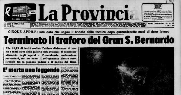 Sotto il colle del Gran San Bernardo, «Burrasca» ha fatto crollare questa sera l'ultimo diaframma di roccia a metà circa del traforo italo-svizzero: «Burrasca» è un minatore veneto, Marcello Pietrobon, il quale ha azionato il detonatore che ha fatto esplodere la volata di mine sistemata nella roccia. L'esplosione è avvenuta regolarmente, alle 21,19.