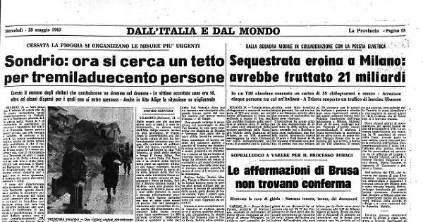 I vigili del fuoco ed i volontari delle squadre di soccorso continuano a scavare tra le macerie delle sei o sette case distrutte a Tresenda, alla ricerca dei dispersi. Sono ben visibili tra i detriti le arcate delle vecchie cantine dove si spera di poter trovare i dispersi. La gente osserva le operazioni di soccorso lungo la massicciata della ferrovia dove si è fermata l'enorme massa di terriccio, dopo aver travolto le case ed aver superato la strada statale.
