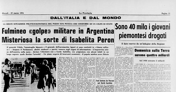 Le forze armate, con un'azione fulminea perfettamente sincronizzata, hanno assunto il controllo di Buenos Aires e delle maggiori città dell'interno, hanno eliminato l'erede di Juan Domingo Peron, cogliendo di sorpresa tutte le forze sulle quali si appoggiava il regime del «Caudillo»: politici, sindacalisti e le masse popolari che tre anni fa avevano trionfalmente riportato al potere il «padre dei descamisados», dopo 18 anni di eclissi, sotto la spinta di oltre sette milioni di elettori.