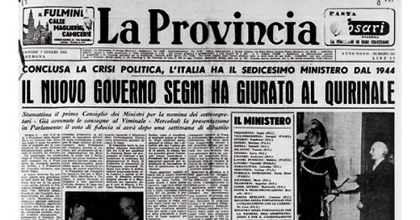 E' questo il I6.0 Governo in Italia dal 1944 ad oggi. Il nuovo Governo pud contare sa una maggioranza precostituita tanto alla Camera, quanto al Senato. Negli ambienti politici si rileva che fl nuovo Governo ha elementi positivi per compiere mi buon lavoro..... Un passo avanti è stato- induboiamente raggiunto sulla via della chiarificazióne sia.perchè è stata realizzata l'unità della DC sia perchè il programma di azióne si presenta preciso e concreto. Le nomine che hanno suscitato maggiore interesse sono quelle di Tambroni al Ministero degli Interni e di Andreotti al Ministero delle Finanze.