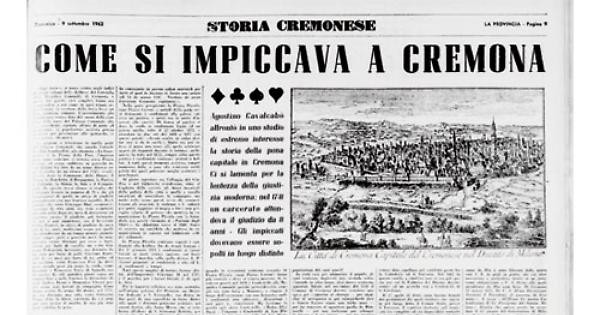 Agostino Cavalcabò affrontò in uno studio di estremo interesse la storia della pena capitale in Cremona. Ci si lamenta per la lentezza dalla giustizia moderna: nel 1741 un carcerato attendeva il giudizio da 8 anni - Gli impiccati dovevano essere sepolti in luogo distinto. Un elenco accurato degli impiccati in Cremona non ci è stato tramandato, però dagli atti di morte o da alcune memorie, si può constatare come la forca venisse rizzata parecchie volte all' anno..... Avveniva qualche volta che, per la rottura della corda, il condannato, anziché rimanere impiccato, cadesse a terra e si rialzasse;dal popolo presente si gridava allora al miracolo e si prospettava il caso alle autorità implorando grazia.