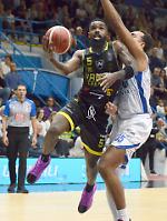 Una entrata a canestro di Phil Booth contro Reggio Emilia. A destra Il play della Juvi Ferraroni, Federico Massone