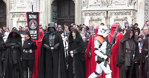 Dart Fener e Han Solo sono sbarcati lunedì 4 maggio a Milano per la terza edizione dello Star Wars Day. Il centro della manifestazione, per tutto il giorno, è l'arena di Milano, trasformata in un vero e proprio Star Wars Village. A mezzogiorno, però, il cattivo di Guerre Stellari ha di fatto marciato su Piazza Duomo, conquistandola. Un sfilata che ha coinvolto tutti i personaggi della saga creata da George Lucas che si sono poi prestati a foto e selfie, facendo la gioia dei moltissimi appassionati accorsi per l'occasione.
